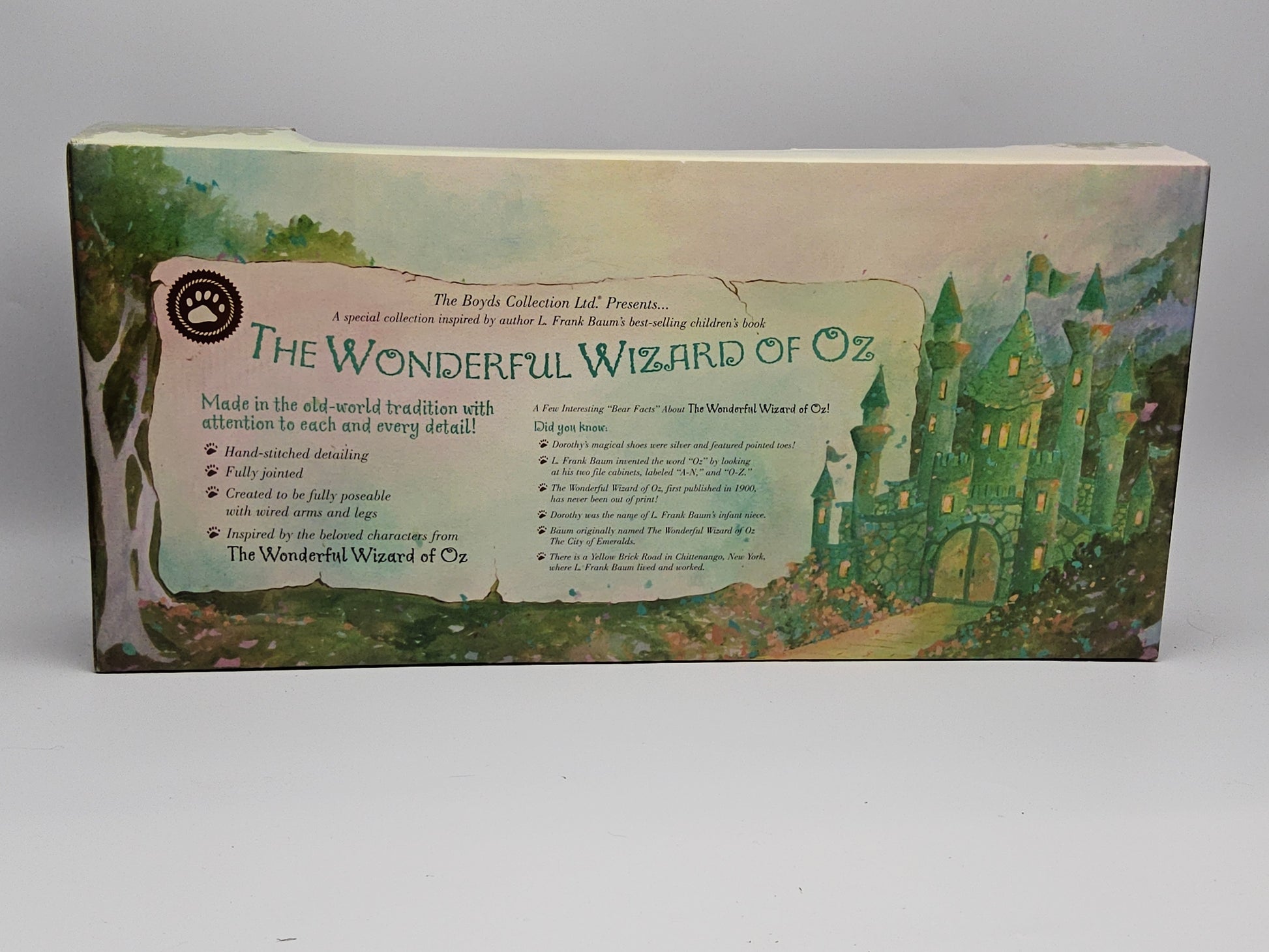 This is the large set of wizard of Oz dolls relased by Boyds bears. Boyds bears were discontinued in 2014 before being relaunched in 2024. These small bears remain in the original packaging and are in excellent condition. This set features 6 characters from the wizard of Oz.