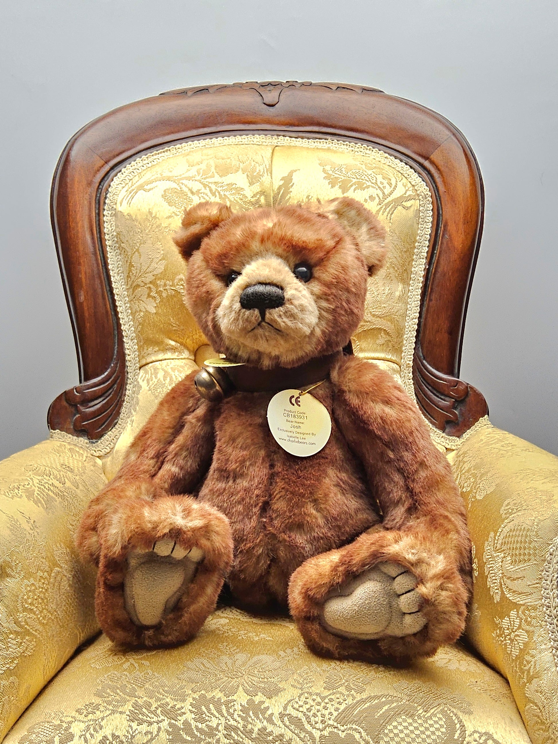 Josh measures approximetely 13 inches, and is made out of a rich caramel tone brown. He is designed by Isabelle Lee, with the tradmark of a thicker stomach and has a hand stitched nose with sculpted paws. He has a bell collar around his neck.
