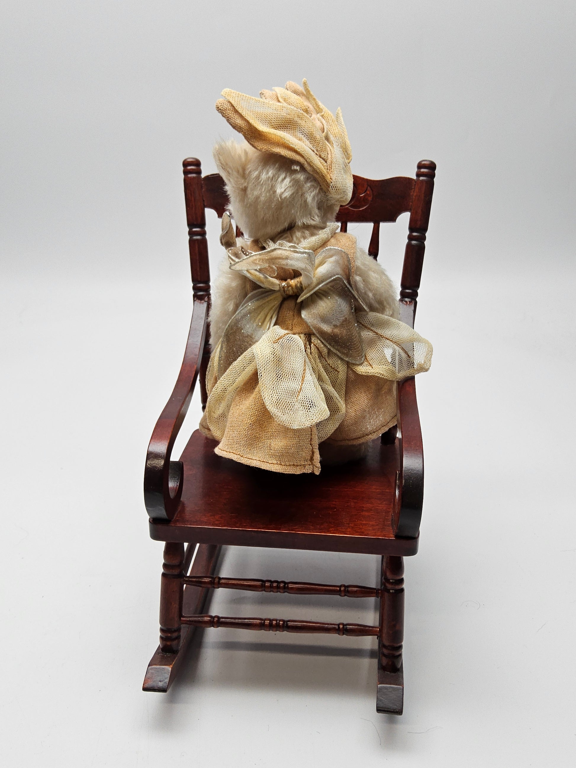 Cuckoo is a minimo bear which is part of the bottom of the garden collection. She is limited edition with only 1200 being released worldwide although her tags are missing. Cuckoo is made of peach delicate mohair. Her outfit is linen and hessian in a mixture of browns and peaches. She has sparkling fairy wings.