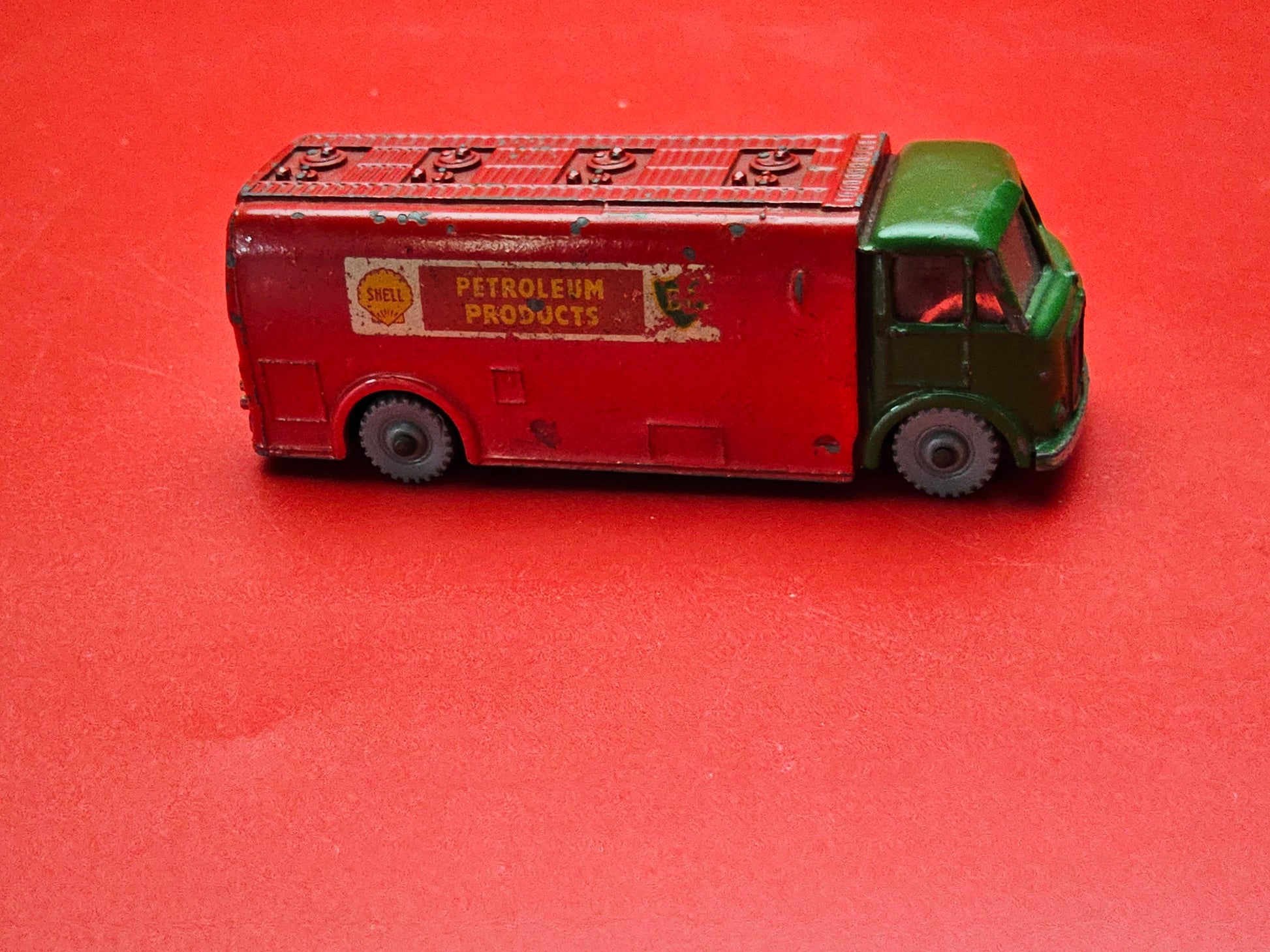 The tanker is in played with condition as seen in the photographs. The body has tarnishing on the metal with paint chips and loss of sticker on the side. The cab has light scratching. However, most of the paint is intact and this is an older model. We have chosen to stock this to allow the collector on a budget to be able to purchase a dinky toy.