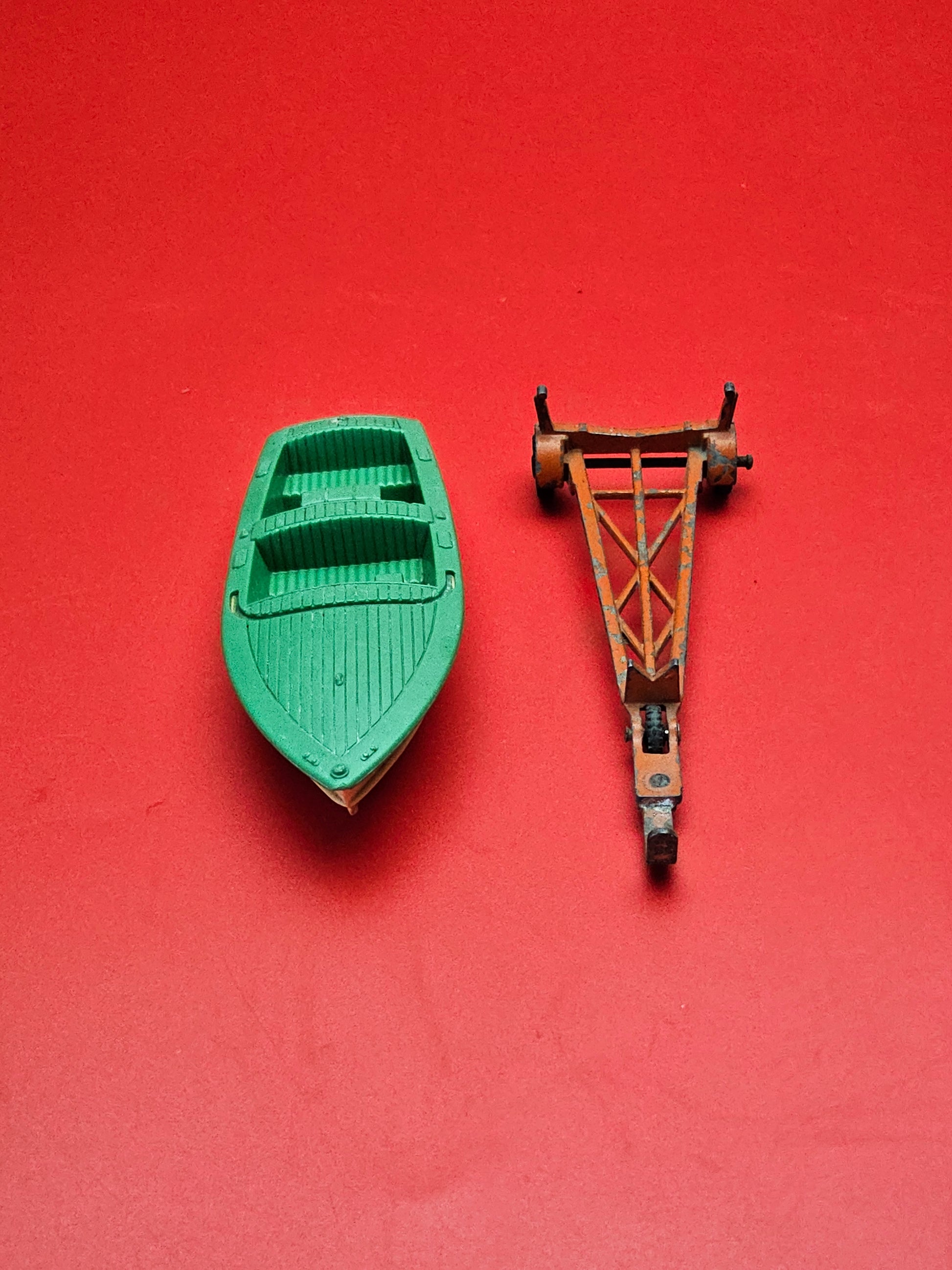 This is a small boat with trailer released by Dinky from 1960 to 1962. The boat is in good order with all colours correct however the steering wheel is missing. The trailer is correct and fits the boat perfectly. The trailer has extensive chipping which can be seen in the photographs. The wheels are in good ordrr and turn easily.