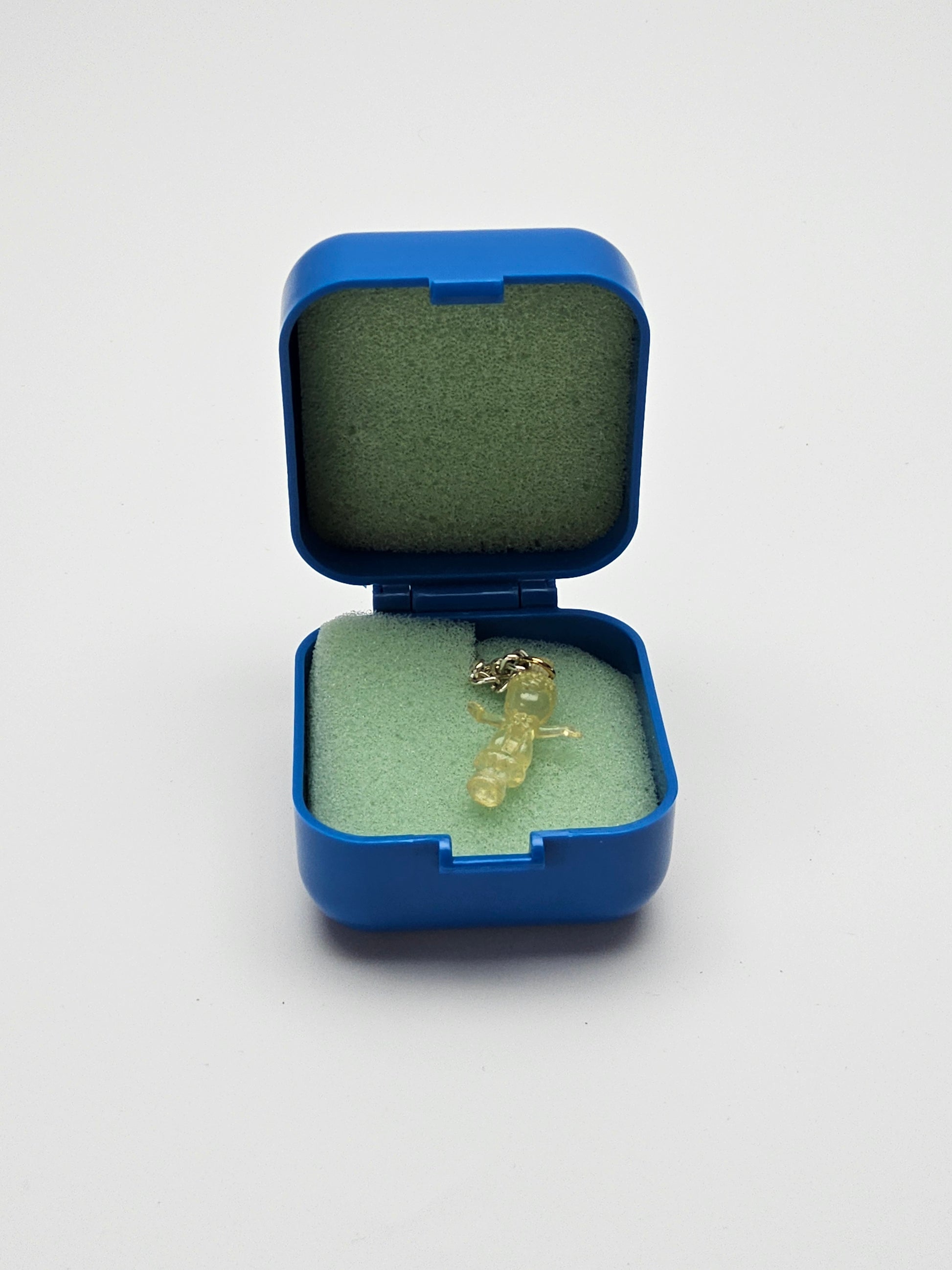 This is one of the pendants which were a mailaway option. The pendant features a clear doll and chain along with a presentation box. The pendant came in 4 poses. The pendant we are offering does show signsmof age. The crystal doll has yellowed over the years and the chain has lost the gold effect leaving it more silver. This doesn't detract from the rarity of this item but does effect the value which is reflected in the price.