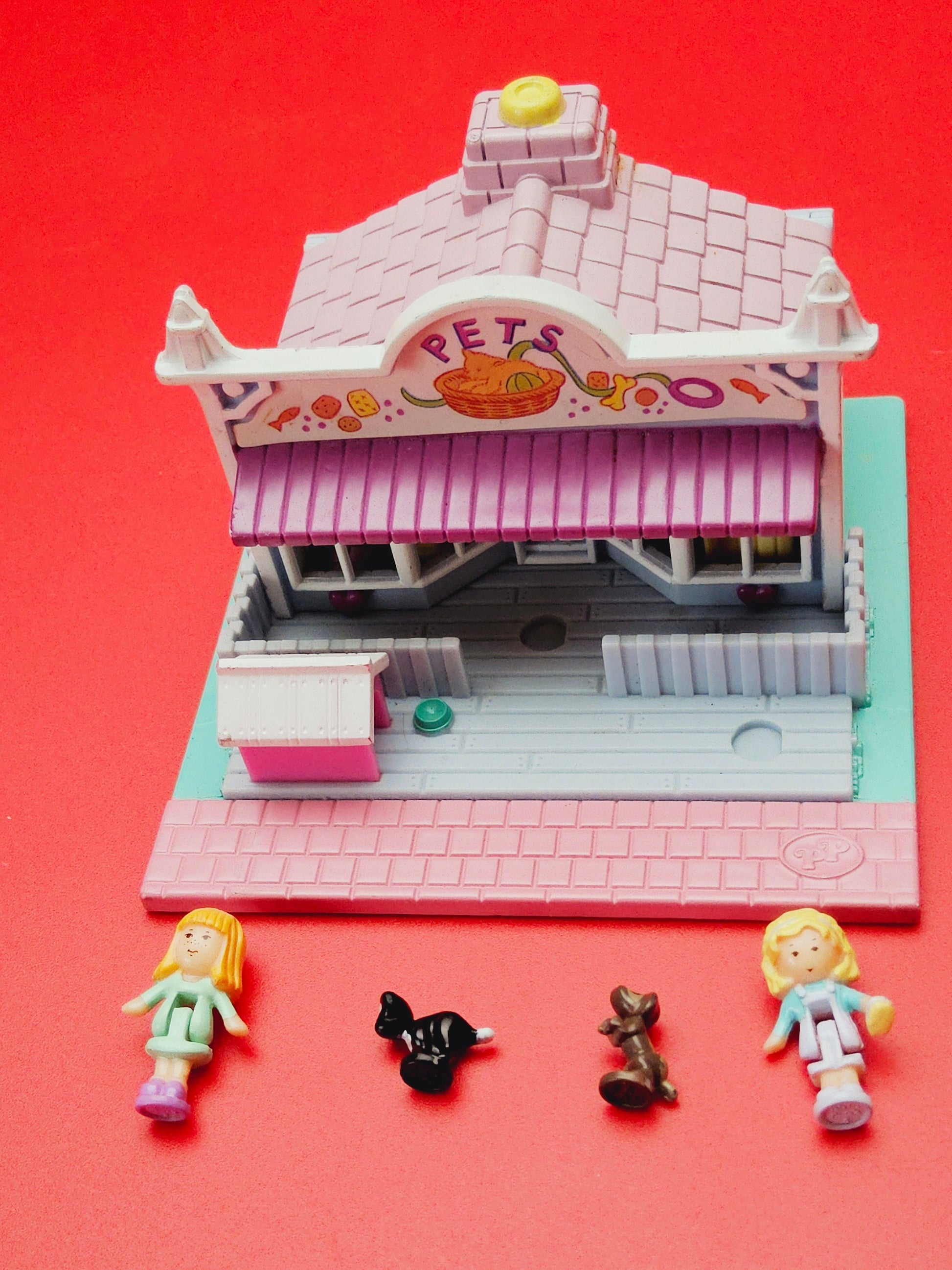 Polly pocket Pollyville pet shop with both dolls, cat and dog.
