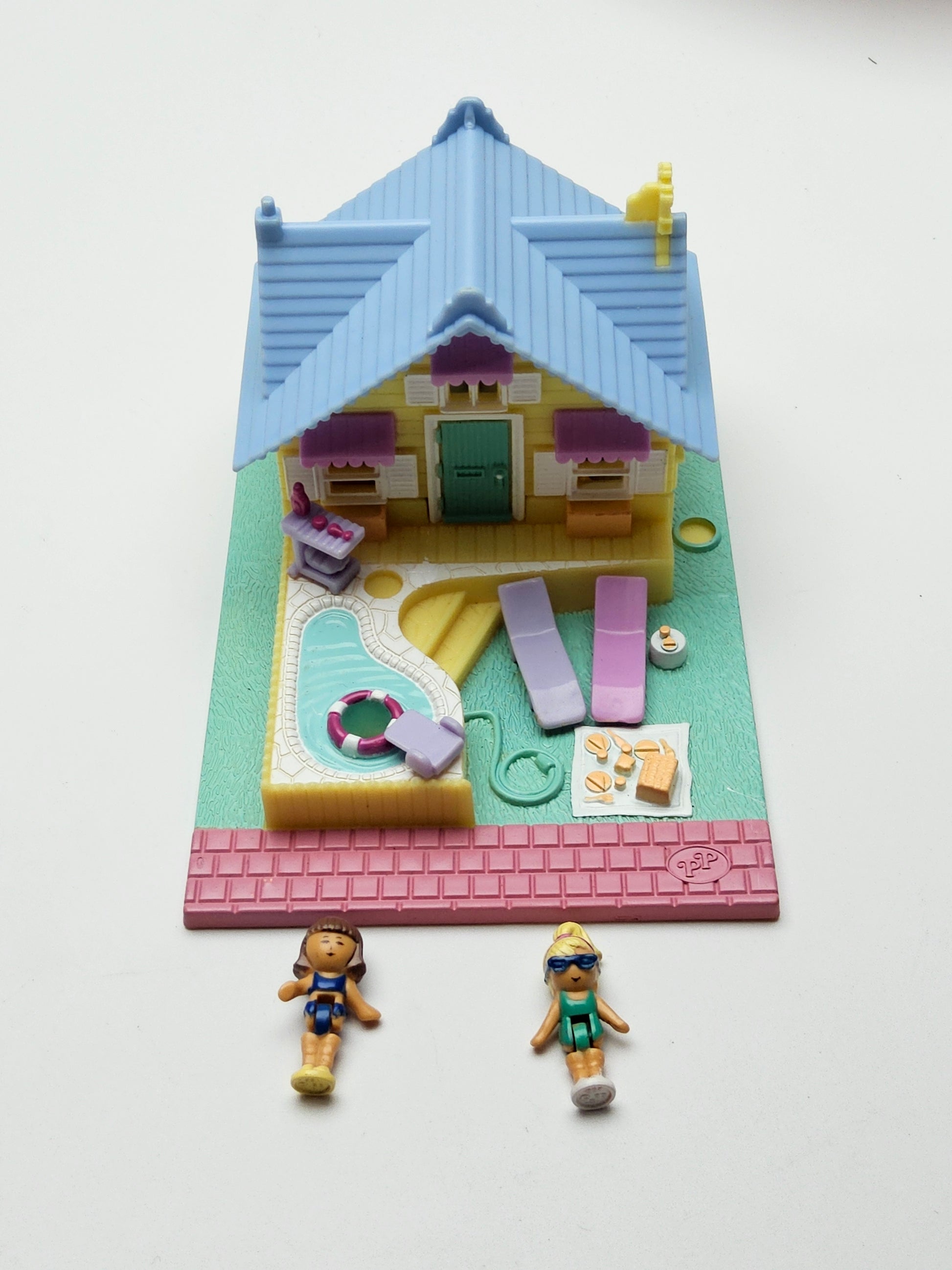This is the summer house from the Pollyville collection. The house is in wonderful condition with no sun fading or damage. All paintwork and stickers are fully intact both inside and out. The set comes with both original dolls which are chip free and clear featured.