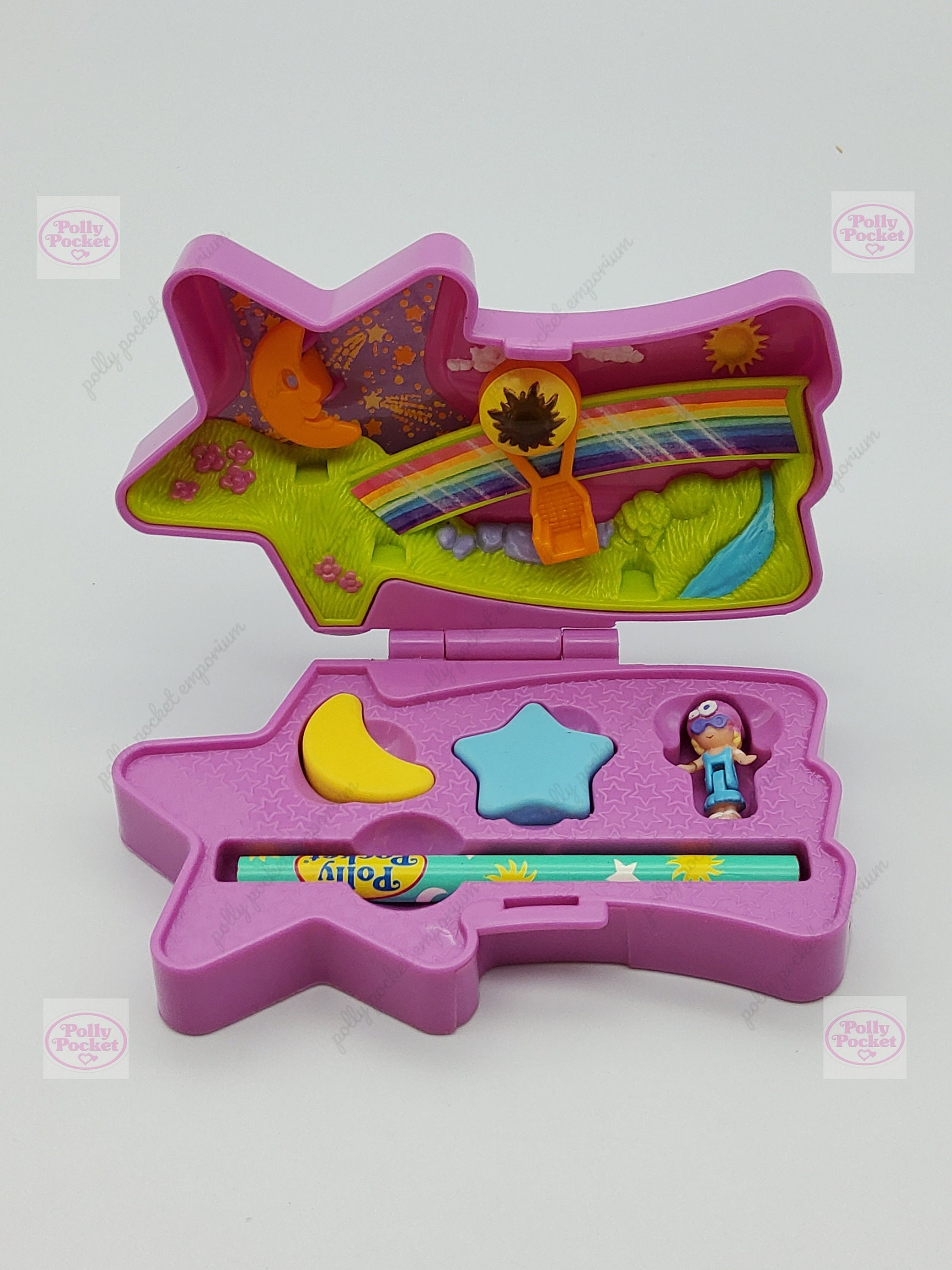 Polly pocket star eraser case with original doll, 2 erasers, pencil and pencil topper.