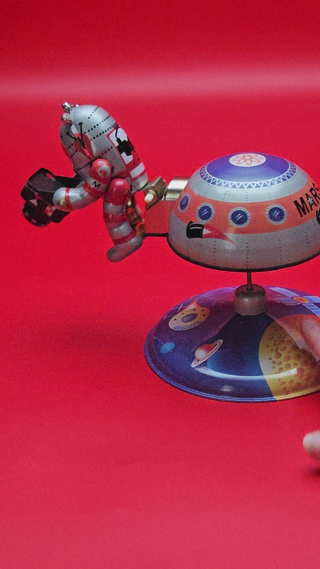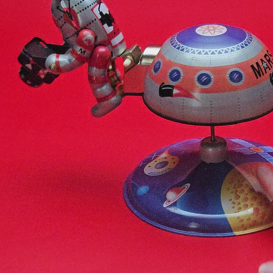 The space station toy comes in 2 pieces with the astronaut being detachable. The paintwork is immaculate with no damage. The item can be wound using the original key which is included with the set. The mechanism moves freely as seen in the video.